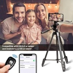 ADJUSTABLE 55″ CELL PHONE TRIPOD SET – With 4 leg sections and quick flip leg lock, the height of phone tripod can be adjusted from 16.3″ to 55″ in seconds to meet your different requirements. Each leg can be extended independently so it can position on uneven surfaces very easily.