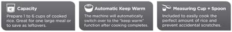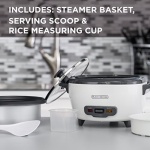 Food Steaming Basket – The included food steaming basket lets you make healthy meals with vegetables, fish, and more. Measuring Cup and Spoon Included – The measuring cup makes it easy to cook the perfect amount of rice, and the plastic serving spoon prevents accidental scratches to the nonstick rice pot. Note: use only the rice cup to measure rice, never a true cup.