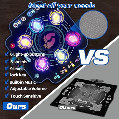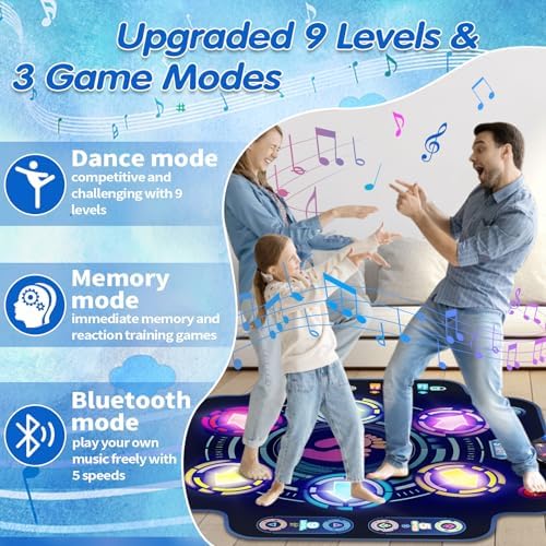 💃【2023 Upgraded Bluetooth Function & 5 speed Levels &Memory Function】– Unique Bluetooth mode with adjustable speed is now coming! The dancing mat is easy to connect with Bluetooth to play your favorite music so that kids can invite friends to join in the dance. Light-up bluetooth dance pad has 5 speeds – helping you to choose more fun while experiencing dance activities. Memory mode exercises the brain and improves your child’s memory in a fun way.
